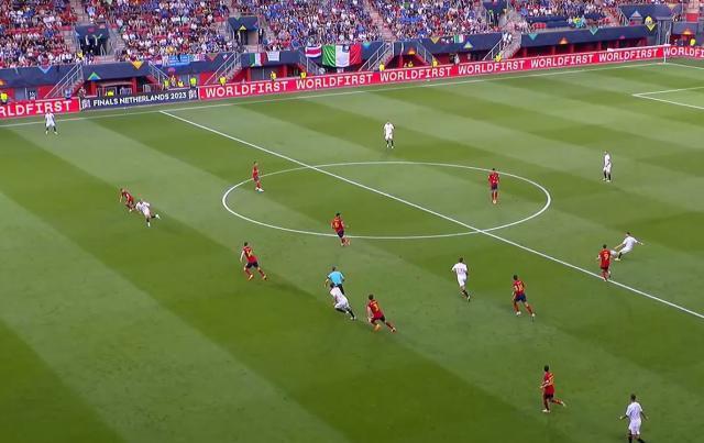 欧国联半决赛,西班牙队在荷兰恩斯赫德对阵意大利队。开场3分钟博努奇禁区前被断球,耶雷米·皮纳为西班牙队首开纪录;第11分钟因莫比莱点射扳平;第88分钟何塞卢禁区内完成绝杀。西班牙2比1淘汰意大利,将在北京时间周日晚9点的决赛对阵克罗地亚。