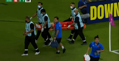 比赛第33分钟,阮晓明与向余望对抗后被担架抬下